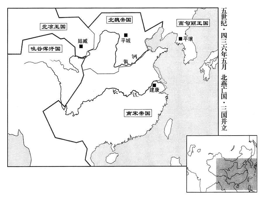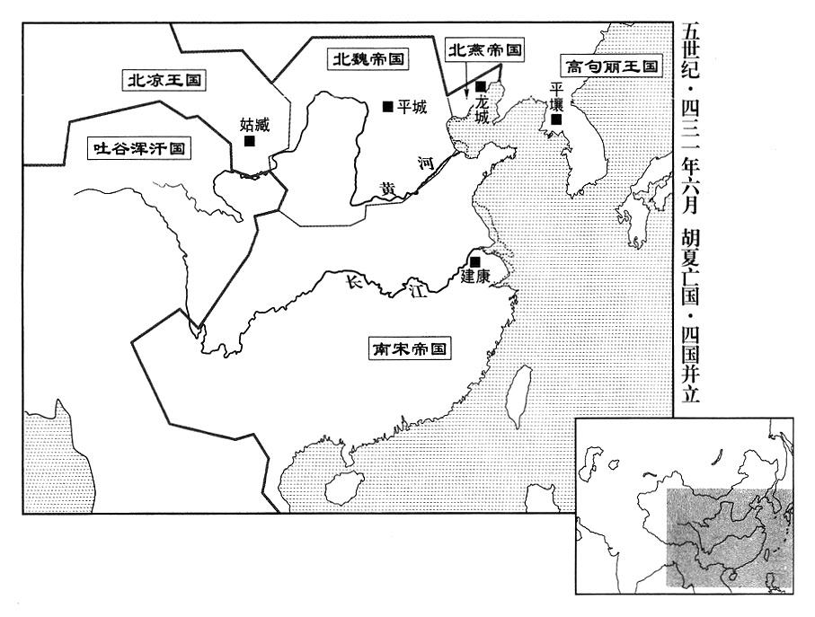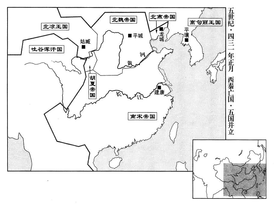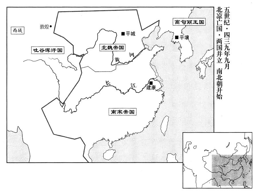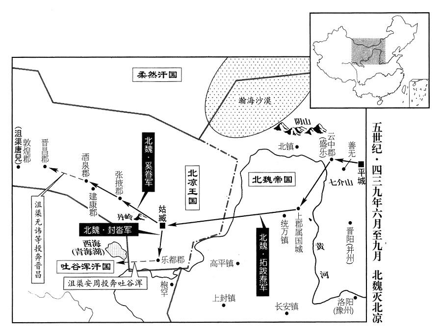 9、北魏帝拓跋焘自云中郡(故都盛乐·内蒙古和林格尔县)渡过黄河。