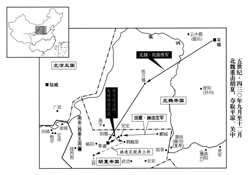 32、十二月十五日,胡夏帝国平凉守将、上谷公赫连社干,广阳公赫连度洛孤,出城投降。北魏帝国占领平凉。