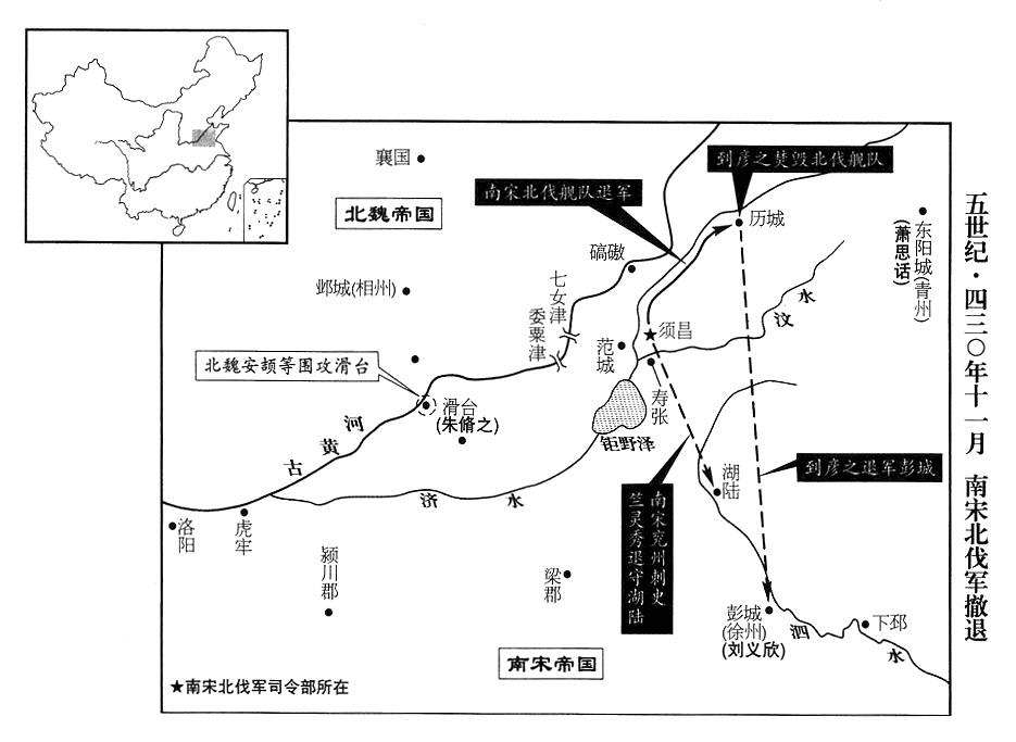 2、正月十五日,南宋帝国(首都建康“〔江苏省南京市〕”)征南大将军檀道济等由清水(济水)逆流西上,援救滑台(河南省滑县)。北魏帝国(首都平城“〔山西省大同市〕”)寿光侯叔孙建、征西大将军长孙道生率军抵抗。
