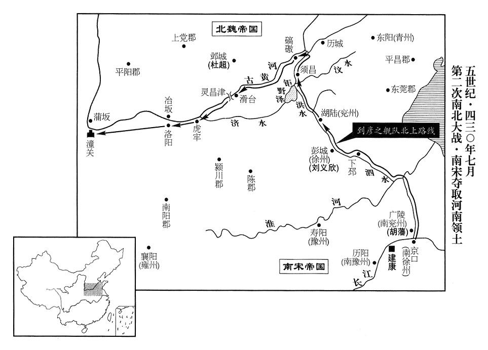 3、南宋帝刘义隆自从登上帝位以来,就有收复黄河以南土地的雄心。三月二日,刘义隆下诏:挑选全副武装士卒五万人,交给右将军到彦之,任命到彦之担任北伐军前锋司令官,率安北将军王仲德、兖州(州政府设湖陆“〔山东省鱼台县东南〕”)州长竺灵秀乘水上船舰,进入黄河。另派骁骑将军段宏率精锐骑兵部队八千人,直指虎牢(河南省荥阳县西北汜水镇);豫州(州政府设寿阳“〔安徽省寿县〕”)州长刘德武率军一万人,随后进发。另命后将军、长沙王刘义欣率军三万人,担任北伐大军总司令(监征讨诸军事)。刘义欣,是刘道怜(一任帝刘裕的老弟)的儿子。