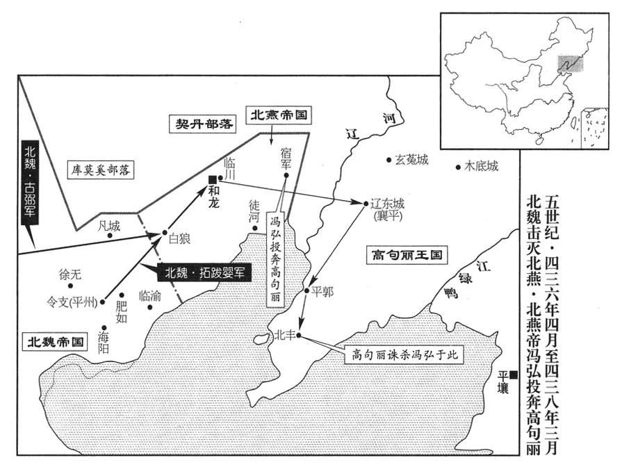 3、最初(参考四三六年五月),北燕帝国天王冯弘被高句丽兵团迎接到辽东(辽宁省辽阳市),高句丽王国(首都平壤“〔朝鲜平壤市〕”)国王(二十任长寿王)高琏派使节慰劳,说:“龙城王冯先生,光临敝国郊野,人马想都疲劳!”冯弘对这种把自己当做宾客,甚至当做部属,而不当做主子的态度,既惭愧又愤怒,于是,以天王身份,下诏斥责高琏。高琏把冯弘安置到平郭(辽宁省盖州市),不久,再送到北丰(辽宁省瓦房店市)。冯弘一向瞧不起高句丽王国,随时随地,肆意侮弄。所以,虽然寄人篱下,仍以独立王国自居,行政司法,跟和龙城(辽宁省朝阳市)时代一样。高琏不能忍受,派出军队,强行夺走冯弘身旁的美丽侍女,又拘捕太子冯王仁,充当人质。冯弘大为怨恨,派使节到南宋帝国,请求出军迎接。南宋帝刘义隆派使节王白驹等,北上高句丽王国,命高句丽王国准备行装,送冯弘南下。高琏不愿冯弘脱离自己手掌,于是,命将领孙漱、高仇等,就在北丰诛杀冯弘(年龄不详),并诛杀冯弘的子孙十余人,追称冯弘谥号昭成皇帝。