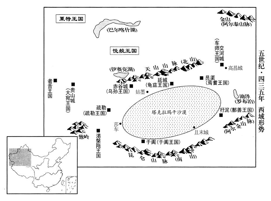 8、北魏帝拓跋焘再派散骑顾问官(散骑侍郎)董琬、高明等,携带大量金钱绸缎,前往西域(新疆及中亚东部),安抚宣慰西域九国(龟兹王国、疏勒王国、乌孙王国、悦般王国、渴槃陁王国、鄯善王国、焉耆王国、车师王国、粟特王国;参考四三五年五月)。董琬等抵达乌孙王国(首都赤谷城“〔中亚伊塞克湖东南中国边境〕”),乌孙国王大为欢喜,说:“破落那王国(即前二世纪的大宛王国,首都贵山城“〔乌兹别克斯坦卡散赛城〕”)、者舌王国(首都者舌“〔中亚塔什干市〕”),都想向魏国(北魏帝国)称臣进贡,只是没有渠道,你们应该绕道安抚!”遂派向导及翻译,送董琬去破落那王国,送高明去者舌王国。邻近其他国家得到消息,争先恐后的派遣使臣,追随董琬等到中国(北魏帝国)进贡,有十六国之多。