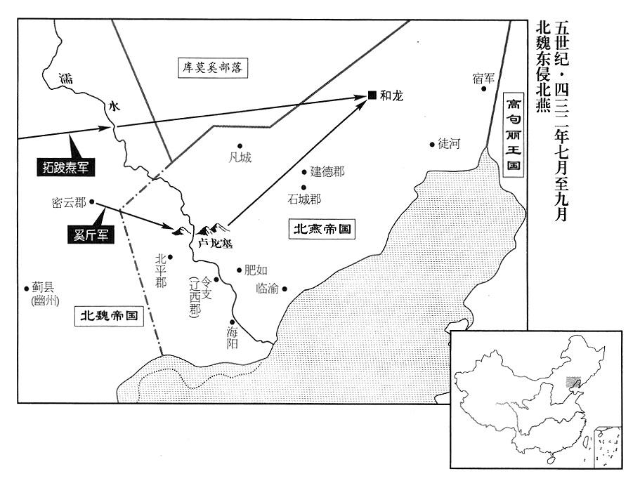 3、二月九日,北魏帝(三任太武帝)拓跋焘(本年三十岁)前往幽州(州政府设蓟县“〔北京市〕”)。