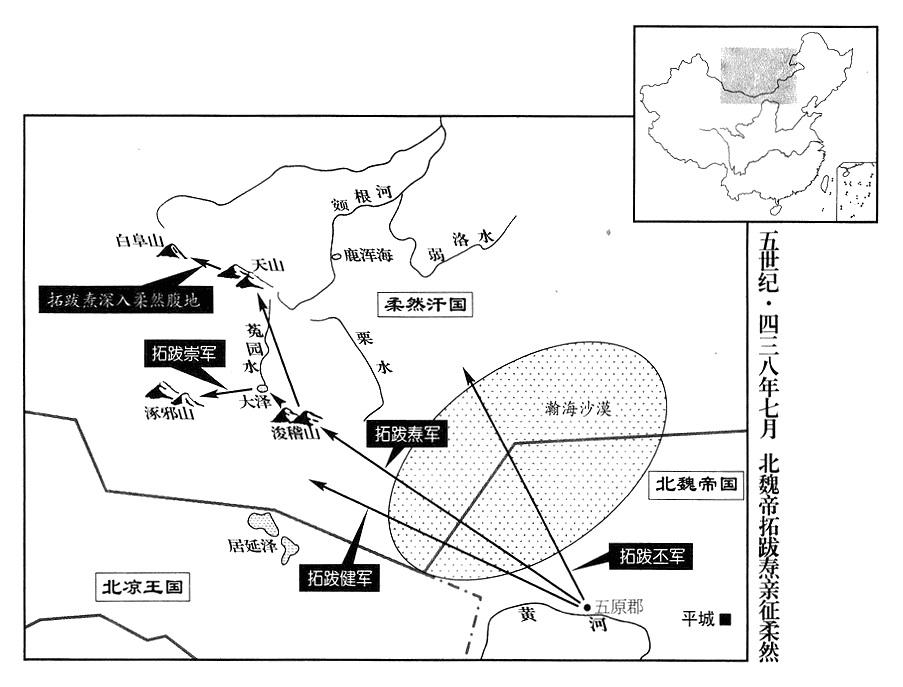 秋季,七月,自五原向柔然汗国(瀚海沙漠群)发动三路并进的总攻击。命乐平王拓跋丕率十五个将领从东路,永昌王拓跋健率十五个将领从西路,拓跋焘亲率主力大军,从中央突破。